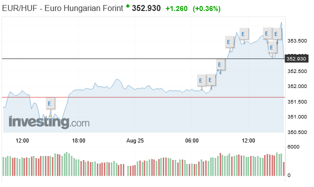 A forint kedden egyhavi mélypontra gyengült az euróhoz képest, eddigi napi mélypontján 353,91 forintot kellett adni a közös európai fizetőeszközért, ami július 20. óta nem fordult elő.