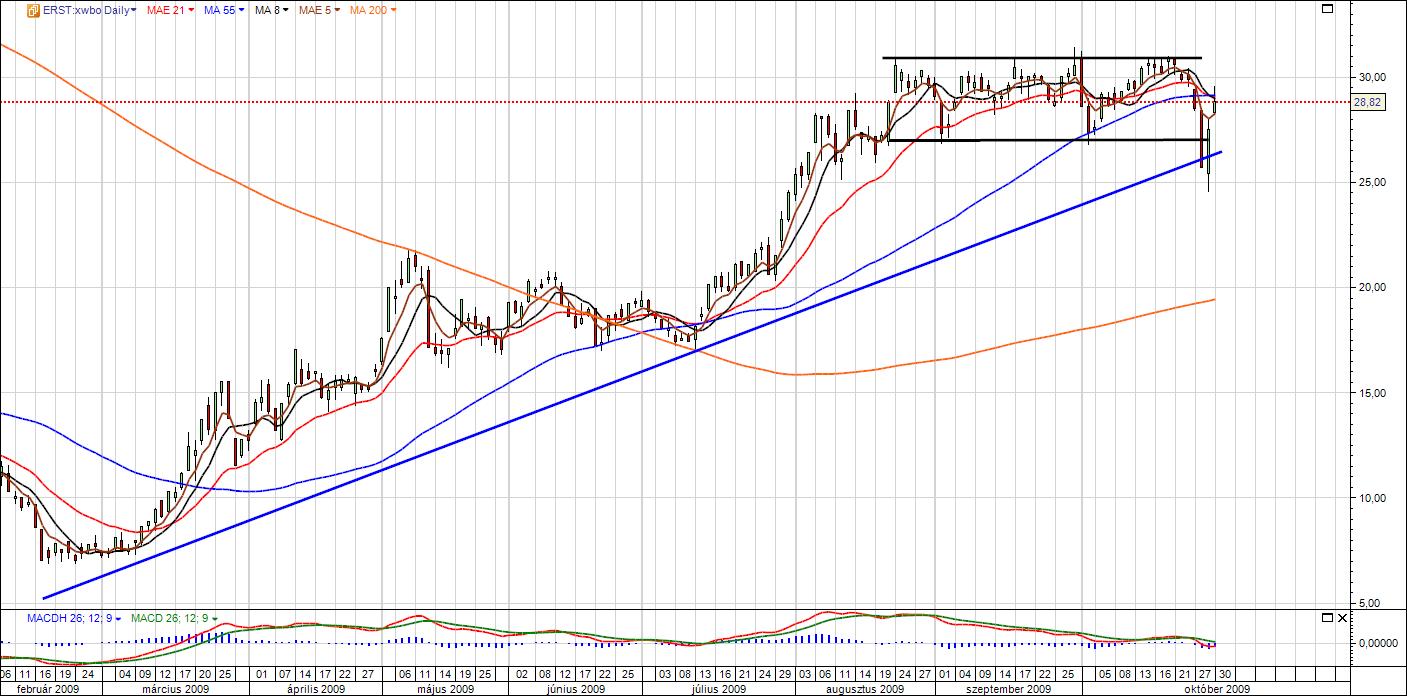 Egyelőre tartja magát az Erste Group részvények árfolyama. Már próbált a héten benézni az emelkedő trendvonal alá, de sikeresen visszapattant róla. A visszahúzást a napvilágot látott jelentésnek köszönhetjük, ami nagy veszteségről számol be, de nem nagyobbról, mint amit az elemzői várakozások prognosztizáltak.