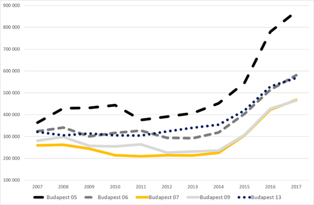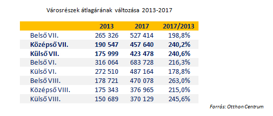 Az elmúlt 5 évben a belvárosi lakások ára a legdrágább belbudai városnegyedek árszintjére emelkedett. Az árak öt év alatt gyakorlatilag megduplázódtak. A legnagyobb mértékben a VII. kerületben nőttek, ahol az öt évvel ezelőtti átlagár 227 százalékáért lehetett lakást vásárolni tavaly. A lakásárak növekedését az alacsony hozamkörnyezetben felértékelődő lakás-befektetési lehetőség és az olcsó hitelek miatt felerősödött kereslet mozgatta.