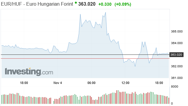 Az euró jegyzése a kora reggeli 365,89 forintról este hét órára 362,97 forintra csökkent, ami a forint 0,8 százalékos erősödésének felel meg.