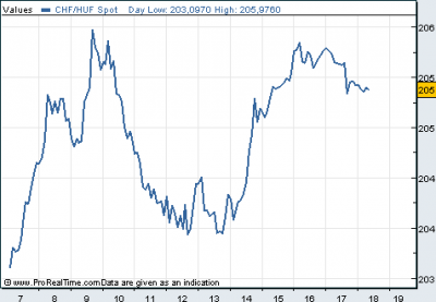 A dollár az idén eddig 5,54 százalékkal erősödött a forinthoz képest. A svájci frank hétfőn délelőtt 203,37 forintot, délután fél négykor 204,08 forintot, este pedig 205,29 forint ért.