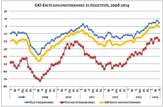 A konjuntúra-index májusban mínusz 1,2 pontra csökkent az előző havi 1,7 pontról. Az üzleti bizalmi index az áprilisi 7,7-ről 4,8 pontra esett, a fogyasztói pedig a mínusz 15,3 pontról mínusz 18,4 pontra romlott.