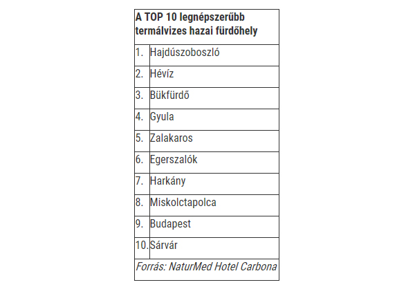 A kutatás eredményei alapján a Top 3 legnépszerűbb termálvizes fürdőhely Hajdúszoboszló, Hévíz és Bükfürdő, melyeket Gyula és Zalakaros, a lista második felében pedig Egerszalók, Harkány, Miskolctapolca, Budapest és Sárvár követ.