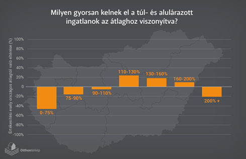 Az adatokból kirajzolódik, hogy az átlagárat 75%-kal alulmúló otthonok esetén a legrosszabb az eladási arány, itt ugyanis jellemzően rosszabb minőségű ingatlanokról van szó. A legjobban pedig a 10-60%-kal az átlag fölé árazott otthonok teljesítenek.