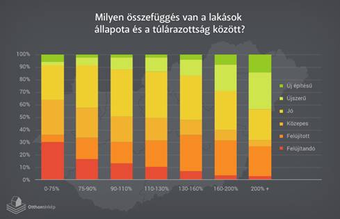 Leginkább a felújítandó és a közepes állapotú otthonokat árazzák alul, ahogy lépkedünk a százalékos árazási skálán felfelé, úgy csökken ezeknek az ingatlanoknak az előfordulása. Ezzel ellentétben az új építésű, újszerű és a felújított lakásokra inkább a túlárazás jellemző.