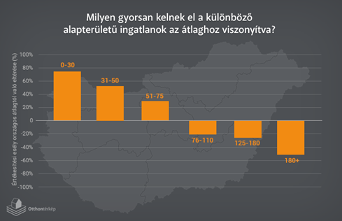 A piacon leginkább a kisebb alapterületű ingatlanok a kelendőbbek. Az Otthontérképen található 50 négyzetméter alatti ingatlanokat például az átlagnál 75%-kal nagyobb eséllyel lehet értékesíteni. Ahogy nő az alapterület, úgy csökken az eladás esélye. A 180 négyzetméter fölötti otthonok esetében tizenkettő ajánlatra már csak egy eladás jut, míg 50 négyzetméter alattiaknál háromra jut egy.