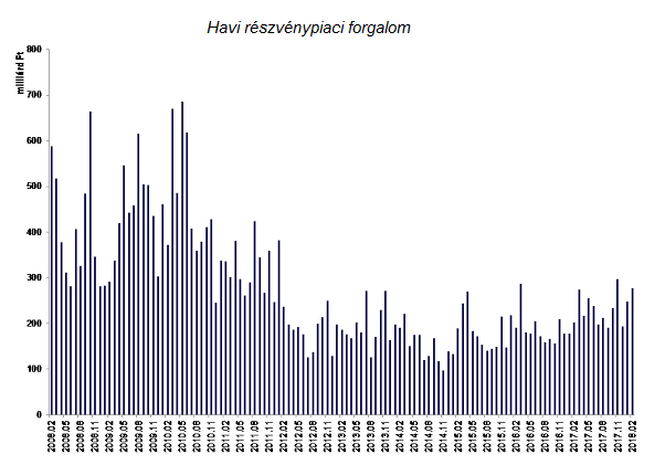 Pozitívumként említhető a hónap magas kereskedési aktivitása is. A 20 kereskedési napos februárban összesen 277,5 milliárd forint értékben kötöttek üzletet a Budapesti Értéktőzsde (BÉT) azonnali részvénypiacán, ami meghaladja az előző hónapban (247,6 milliárd forint) mért adatot, ahogyan a tavalyi év hasonló időszakának értékét (202,1 milliárd forint) is.