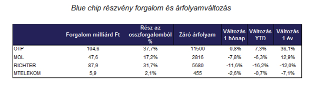 A képzeletbeli forgalmi dobogó harmadik helyére csúszott a MOL (47,6 milliárd forintos forgalom). Az olajipari részvénynél határozottan a nemzetközi energetikai részvények hullámzása okozott 7,8 százalékos esést, mert a társaság amúgy az elmúlt évtized legjobb eredményét, a várakozásokat is bőven meghaladó számokat jelenthetett be.
