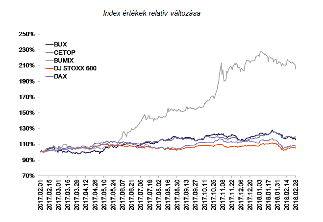 Egy kis kitekintéssel kezdve, az Egyesült Államokban és általában a globális részvénypiacokon, illetve makrogazdaságokban a növekedéssel, illetve a vezető részvénytársaságok teljesítményével továbbra sincs gond. Ugyanakkor erősödtek a kamatemelési és inflációs félelmek, emiatt február némi megtorpanást hozott a tőzsdéken, rendkívüli volatilitással. Februárban, a vezető amerikai tőzsdeindexek (Dow Jones, Nasdaq, S&P 500) olykor 3,5-4,5 százalékkal is képesek voltak egyetlen kereskedési nap alatt zuhanni, majd visszapattanni.