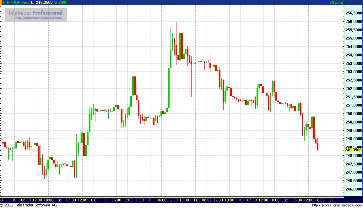 A svájci frankot szerda délután 248,32 forinton jegyezték a kedd esti 252,40 forint után, a dollár jegyzése 238,44 forintra csökkent 241,49 forintról, a japán jen árfolyama pedig 3,0158 forinton áll a kedd esti 3,0919 forint után. (MTI)