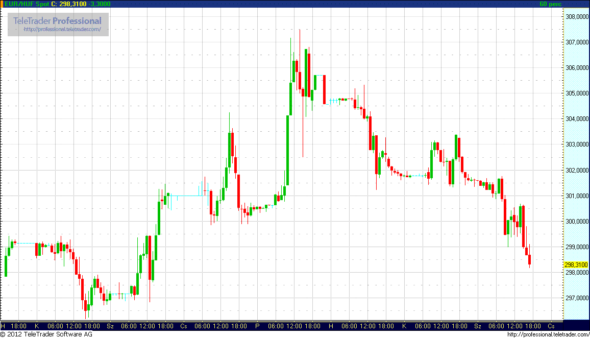 Az euró jegyzése az euróövezeti szuverén adósságszolgálati válság éleződésének jeleire a múlt héten, csütörtökön emelkedett a 300 forintos határ fölé és pénteken már 307 forint feletti jegyzésekre is volt példa. Az eurót 307 forint felett utoljára az idén január 18-án jegyezték. A forint árfolyama január 5-én 324,27-es euró jegyzésen érintette történelmi mélypontját.
