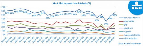 A tavalyi évben elért mélypontot követően folyamatosan javul a hazai kkv-k beruházási kedve. „Jelenleg a vállalkozások 56%-a gondolja úgy, hogy valamilyen fejlesztésbe kezd a következő egy év során, ami erőteljes javulás a tavalyi mélyponthoz képest (34%). Azonban azt is látni kell, hogy ez az arány még mindig alacsony, és a cégek beruházási szándéka nem tud tartósan 60% felett maradni. A nagy beruházási dömping tehát várat még magára. Ezt támasztja alá a KSH legutóbbi adata is, amely szerint az idei első negyedévben a nemzetgazdasági beruházások volumene 9,6%-kal maradt el az előző év azonos időszakához képest” – mondta el Kovács Viktor Zoltán, a K&H kkv marketing főosztály vezetője. A célokat tekintve informatikai fejlesztésekre készülnek a legtöbben (30%). Ezt követően a gépek, berendezések korszerűsítését közel minden negyedik cég (24%) tervezi, míg a gépjárműpark korszerűsítésében az előző negyedévhez hasonlóan a kkv-k 15%-a gondolkodik.
