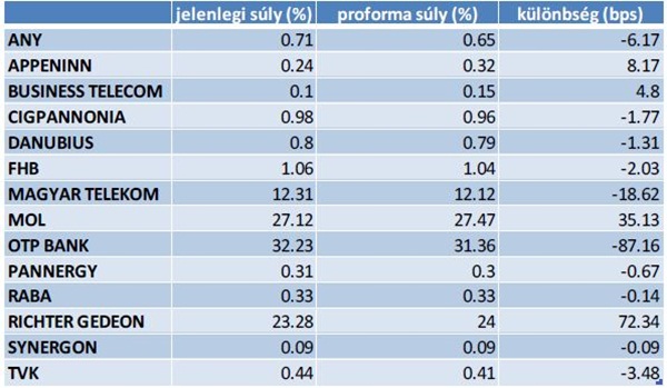 A BUX index 14 tagjában nem történik változás, sőt az index súlyok esetében is a legnagyobb változás is kevesebb, mint 1 százalékpont. A BUX index súlyozásának változásai az alábbi indexben követhető nyomon.