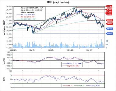 A hangulat elég változékony, ezért vételi pozíciót csak rövidtávra érdemes nyitni, felkészülve a hirtelen irányváltásokra. A trend azonban továbbra is lefelé mutat, ezért ha ismét megjelnnek az eladók, akkor gyors esés veheti kezdetét. Támaszok 19.450 és 18.000 forintnál láthatók.
