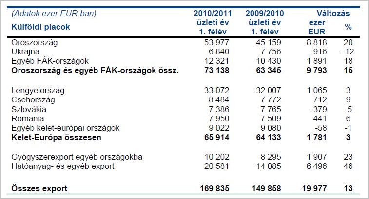 Az üzleti év első félévének konszolidált árbevétele 63 489 millió Ft-ot tett ki, 13%-kal többet a múlt évinél. A stratégiai piacok 10%-os forgalombővülése mellett az egyéb piacokon 40%-os volt a félév növekedése. Az üzleti év első félévének bruttó eredményhányada 56,2%, a tavalyi évinél 0,6%-ponttal magasabb. A félév bruttó fedezeti hányadát az árfolyamok kedvező alakulása mellett a költséghatékonysági intézkedések is befolyásolták.