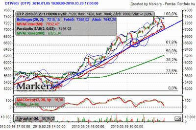 A túlvetté vált papír eserében a korrekció már pénteken megkezdődött a tegnapi csökkenés csak annak folytatása volt. Az árfolyam a nap végére a 7000 forintos támaszát is elérte. Az igazi kérdés csak az, hogy elesik-e a 7000 forintos szint, mert ha igen, akkor az már a lendület megtöréséről árulkodna, és 6550 forint elérését vetítheti előre.