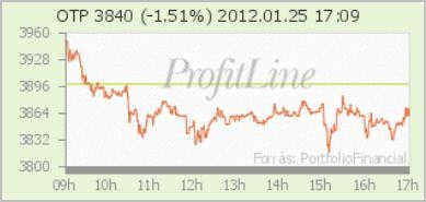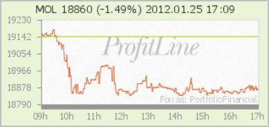 A Mol 285 forinttal, 1,49 százalékkal 18.860 forintra csökkent, 1,0 milliárd forintos forgalomban. Az OTP részvények ára 59 forinttal, 1,51 százalékkal 3.840 forintra esett, forgalmuk 8,5 milliárd forintot tett ki. A Magyar Telekom árfolyama nem változott 550 forintot ért, forgalma 213,6 millió forint volt. A Richter papírok árfolyama 180 forinttal, 0,50 százalékkal 36.020 forintra gyengült, a részvények forgalma 779,1 millió forintot ért el. A másik gyógyszeripari részvény, az Egis 22,7 millió forintos forgalom mellett 105 forinttal, 0,62 százalékkal 17.000 forintra erősödött. A kis és közepes részvények indexe, a BUMIX 1.311,66 ponton zárt szerdán, ez 2,62 pontos, 0,20 százalékos emelkedés a keddi záráshoz viszonyítva. (MTI)