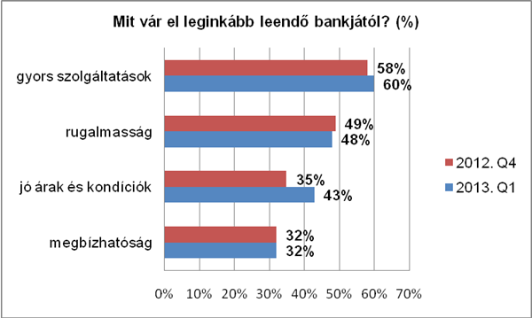 Az 550 hazai nagyvállalat megkérdezésével történt K&H nagyvállalati monitor kutatás legfrissebb eredményei szerint az új bank kiválasztásánál továbbra is a gyors ügyintézés a legfontosabb, ezt várják el legtöbben (60%) leendő pénzintézetüktől. Ezt követi a rugalmas banki kiszolgálás fontossága, amit a megkérdezett nagyvállalatok közel felének (48%) meghatározó szempont. Csupán a harmadik leggyakrabban említett szempont a minél kedvezőbb árak és pénzügyi kondíciók nyújtása, ugyanakkor ez a szempont az előző évi kutatási adatokhoz képest valamelyest emelkedett, 35%-ról 43%-ra. Ez a változás főként a nagyvállalatok működési költségeinek további tervezett csökkentésével, de a sokszor megnövekedett adóterhek miatt legalább szinten tartásával indokolható – mondta el Huszár Róbert, a K&H Vállalati és intézményi banki szolgáltatások üzletág vezetője.