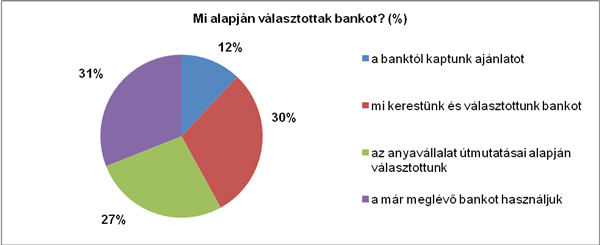 A nagyvállalati szektorra egyforma arányban jellemző, hogy a már meglévő bank szolgáltatásait használják tovább, saját maguk keresnek bankot, illetve, hogy az anyavállalat útmutatása alapján döntik el, melyik pénzintézettel működnek együtt. Ennél jóval kisebb arányban (12%) fordul csak elő, hogy a banktól kapott ajánlat alapján dönt a cég. Az export-import tevékenységet nem folytató cégeknél ennél jóval erősebb az elkötelezettség a már meglévő bank iránt, mivel többségük (58%) a már meglévő pénzintézetnél marad” – részletezte az eredményeket Huszár Róbert.