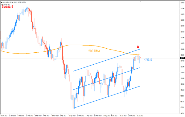 A Brent típusú kőolaj árát a múlt héten jelentősen megdobta a dollárgyengülés amit Ben Bernanke beszéde váltott ki, az árfolyam megközelítette a 109 dolláros hordónkénti árat, ahová a 200 napos technikai ellenállás is esik. A héten szerdán és csütörtökön is beszédet tart a Fed elnöke, így az olajkereskedőknek érdemes lesz a dollárárfolyamára koncentrálnia. A hétfői napot egyébként dollárerősödéssel kezdi a devizapiac, az EURUSD kereszt momentumát tekintve könnyen elképzelhető az 1,30-as szintek alá való beesés, az alapszabály szerint a zöldhasú erősödése nem kedvez a kőolaj árfolyamának, így együtt a napos technikai ellenállással érdemes lehet egy óvatos shorttal megpróbálkozni.