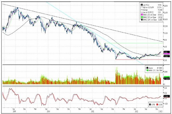 A hosszú távú grafikon alapján továbbra is egy csökkenő trendben mozog az árfolyam, azonban a rövidebb távú mozgások már emelkedés irányába mutatnak. Az elmúlt hónapokban mutatott oldalazás után emelkedésbe kezdett a részvény árfolyama. A profit realizálását 6,9 eurónál javasoljuk, ahol egy szint és a hosszú távú csökkenő trend egybeesése figyelhető meg, ezért ennél magasabb szintre csak nehezen tudna az árfolyam emelkedni. A veszteséglimitáló stop-loss megbízást javasoljuk a 20 és a 30 napos mozgóátlag, valamint a 3,77 eurónál elhelyezkedő stop-loss megbízás alá elhelyezni 3,75 euróhoz. Az így felvett pozíció hozam/kockázat nagysága közelíti a 4:1 arányt. A 2012-es évben a forgalom egyértelműen megnövekedett az előző évekhez képest, ami azt mutatja, hogy ismét megnőtt az érdeklődés iránta.