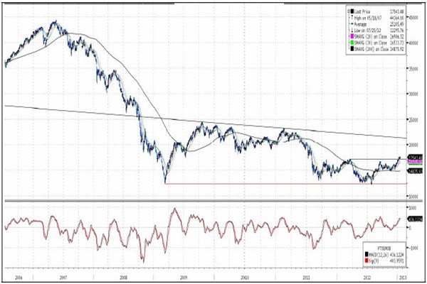 Az elmúlt években a svájci frank, mint jellemző menedék deviza rendkívül erős volt, azonban a mostani gyengülése a kockázati étvágy növekedésének jelének tekinthető. Amennyiben a kockázati prémium tényleg jelentős mértékű csökkenést mutatna, annak legnagyobb nyertesei azok az instrumentumok lehetnének, melyek a válság alatt legkevésbé voltak kedveltek, így például jelentős rally elé nézhetünk a bankszektorban és a mediterrán térségben is. Az olasz bankszektorról, mind a kettő kombinációjáról már nem is beszélve. Az olasz tőzsdeindex (FTSE MIB) teljesítménye látható a lenti grafikonon, melyen látható, hogy 2007 és 2012 között jelentős árfolyamcsökkenés volt megfigyelhető, azonban a tavalyi év második fele az emelkedés jegyében telt és éppen egy éves bázisból tör ki az árfolyam.