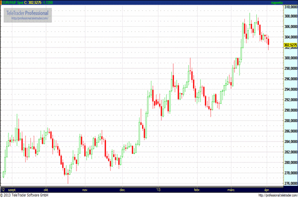 EUR/HUF (301,50 – 305,50): Az MNB mai közleményében az államadósság tavaly év végi helyzetéről ad friss áttekintést. „Az államháztartás bruttó, konszolidált, névértéken számításba vett (maastrichti) adóssága 2012 végén a GDP 79,2 százaléka volt (22381 milliárd forint). A negyedik negyedévben a nettó hiteltörlesztés 102 milliárd forinttal csökkentette, miközben a forint gyengülése 278 milliárd forinttal növelte az adósságállományt.” A harmadik negyedév végén 78,4% volt a GDP arányos államadósságráta. Az idei első negyedévi hasonló adatot pedig a forint gyengülése - 291,50-ről (jan1.) 303,50-re (ápr.1.) – fogja látványosan rontani.