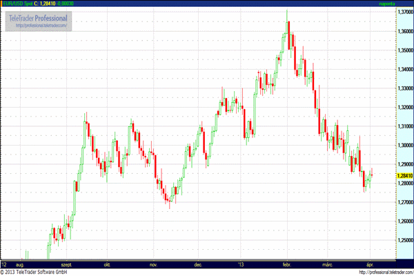 EUR/USD (1,2800 – 1,2920): Április első napján az euro feltámadt 1,28 alatti mélyrepüléséből, a mai aktív kereskedésben pedig meglátjuk sikerül-e tartóssá tenni ezt a csodát. Az ok a tegnapi negatív meglepetést hozó feldolgozóipari ISM adat volt. Hatására a dollár komoly nyomás alá került, mivel az adat azt mutatja a FED döntéshozóinak, hogy szükséges a gigantikus volumenű monetáris lazítás megtartása, mert az amerikai gazdaság a QE3 lélegeztetőgépén él.
