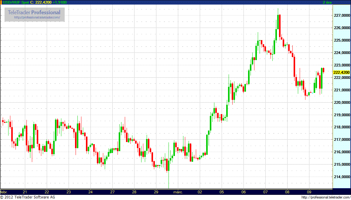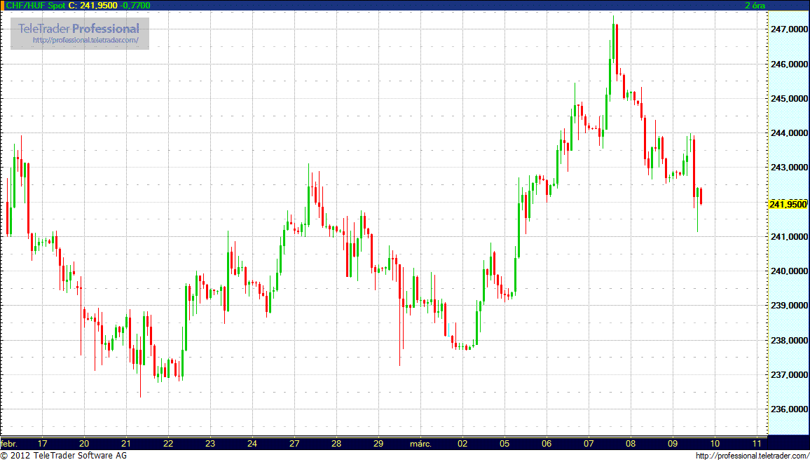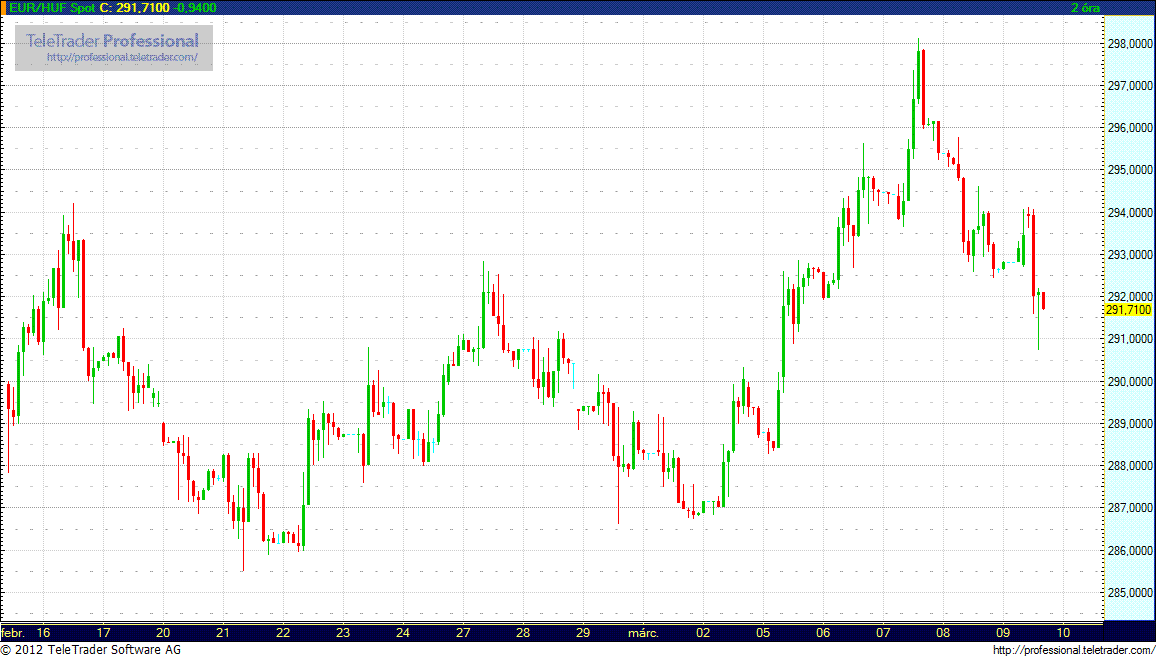 Szerdán a forint egészen 297,36-os euró jegyzésig gyengült a görög adósságcserét megelőző aggodalmak miatt a nemzetközi piacokon kialakult befektetői kockázatkerülés, illetve a magyar EU/IMF készenléti elővigyázatossági hitelkeretről folyó tárgyalások elhúzódását valószínűsítő piaci vélemények miatt. Csütörtökön a forint viszont már erősödött a görög kötvénycsere sikeres lezárásában bízó piaci környezetben, köszönhetően az EU/IMF-megállapodás mielőbbi megkezdésére és gyors lezárására tett magyar elkötelezettségnek.