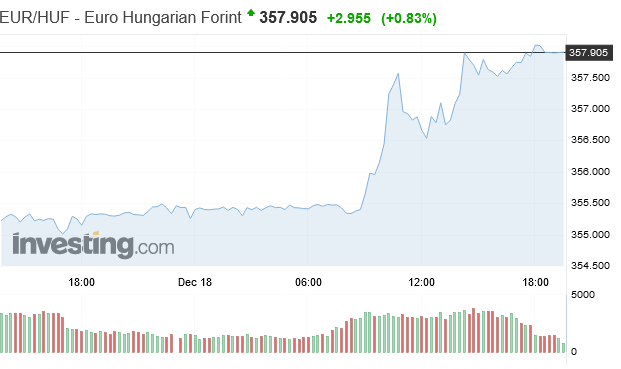Az euró 358,02 forintra erősödött 18.15 órakor a reggel hét órakor jegyzett 355,47 forintról.