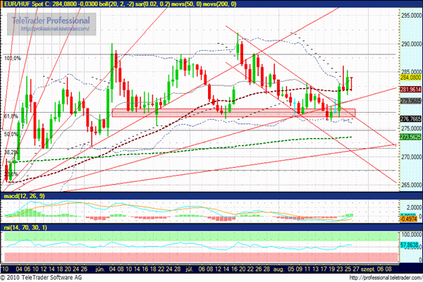 Elég határozottan indult felfelé az árfolyam, mióta kitört a csökkenő sávból, ugyan veszített lendületéből, miután 286 forint felett is járt, azonban a csökkenése során az 50 napos mozgóátlag (281,95) tegnap és kedden is megfogta.