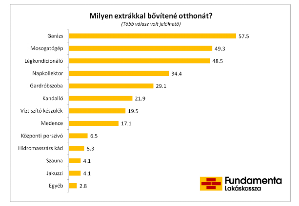 A legtöbben garázzsal bővítenék, vagy mosogatógéppel, légkondicionálóval korszerűsítenék otthonukat – derül ki a Fundamenta országos kutatásából. A megújuló energia népszerűségét mutatja, hogy a dobogósoktól kis lemaradással következik a napkollektor, a ruhatárak növekvő méretére pedig az ötödik helyezett gardróbszoba iránti igény utal. Szerencsére a népszerű lakásextrákkal kapcsolatos álmukat ma már egyre többen meg tudják valósítani, hiszen költségük kigazdálkodható az államilag támogatott lakástakarék igénybevételével.
