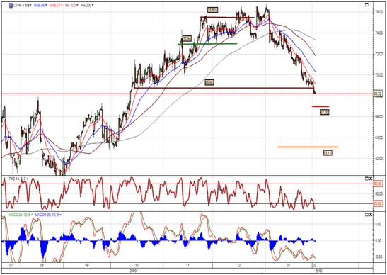 A gyapot is csúnyán túladottá vált, valamint az is fontos, hogy éppen egy kritikus szintnél tartózkodik, mert a 68,6-os szint alá szúrt, ami további eséseket eredményezhet. Sajnos a hely is nagy az egyes szintek között, így a következő támasz a 67-es szint lehet. További esés esetén a 63,11-es szint lehet a következő. (Solar Capital)