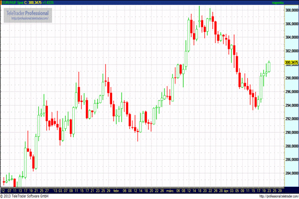 Az egyébként kedvező verdikt a túlzott deficit eljárás megszüntetésének esélyére lehet jó hatással, ami lévén jövőre választási év lesz, egy esetleg lazább fiskális politika valószínűségét növelheti, bár ezt a kormény már többször cáfolta. Az amerikai kereskedésben kialakuló jó hangulat hatására 299-es szint közelébe korrigált az árfolyam, és a ma reggel is innen indult. A vártnál rosszabb német PMI adat nem tesz jót a kockázat vállalási hajlandóságnak, ami a forint árfolyamára is negatívan hathat. A kamatdöntés előtt egy kisebb gyengülés sem elképzelhetetlen, de ha a többség által várt 25 pontos csökkentést jelentik be, amivel újabb történelmi mélypontra 4,75%-ra csökkenne a kamat, akkor van esély, hogy megnyugszanak a kedélyek és visszaáll a kereskedés a 293-298-as sávba.