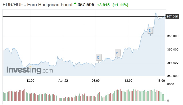 Az euró jegyzése 357,41 forintra erősödött délután negyed hétkor a reggel nyolckor jegyzett 354,29 forintról.