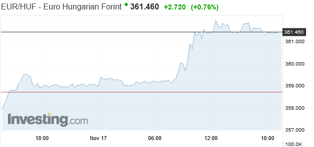 Az euró 361,40 forinton forgott este hét órakor, 2 forint 20 fillérrel nőtt a közös európai fizetőeszköz árfolyama a reggeli 359,20 forinthoz képest. A napi kereskedésben a 358,86 és a 362,05 forint közötti sávban mozgott az euró jegyzése.
