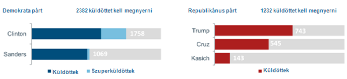 Amint az alábbi grafikonon látható, Hillary Clinton és Donald Trump az elmúlt két hónap előzetes választásainak eredménye alapján szilárdan bebetonozta magát a két első helyre. Az idei „Szuperkedd” eredményeit egyes táborok a „Vízválasztó Kedd” néven is emlegetik, mivel kiderült, hogy a novemberi általános választáson nagy valószínűséggel Clinton-Trump párharc várható. Ettől függetlenül Trumpnak még keményen bele kell húznia, hogy a maradék küldöttek közül eleget győzzön meg ahhoz, hogy ő legyen a republikánusok jelöltje – főleg, ha továbbra is ilyen ütemben haragítja magára a női támogatóit.