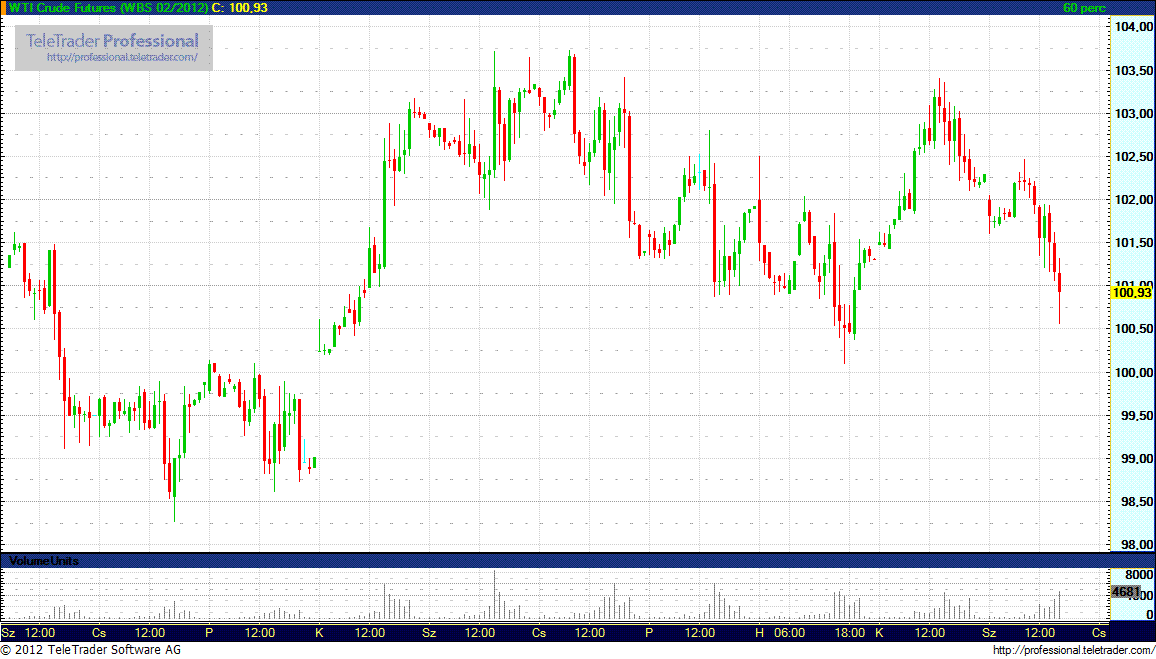 A februári szállítású WTI árfolyama 1,55 dollárral, 1,6 százalékkal 100,66 dollárra csökkent a Nymex piacán. Az EIA ma közzétett adatai alapján az amerikai olajtartalékok 5 millió hordóval emelkedtek, a várakozásokban szereplő 1 millió hordós csökkenéssel szemben. A benzin készletek 3,6 millió hordóval emelkedtek, holott az elemzők 1,8 millió hordós bővülésre számítottak. A finomított készletek a várt 1,4 millió hordó helyett 4 millióval emelkedtek.