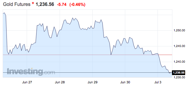 Tovább csorog lefelé az arany árfolyama, ismét az 1.233 dollárnál található 200 napos mozgóátlagot közelíti.