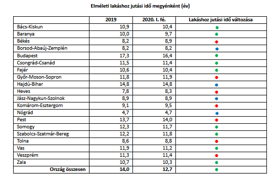 Nyolc megyében és Budapesten is csökkenő tendencia figyelhető meg, míg hét megyében 2019-hez képest tovább nőtt az átlagos lakáshoz jutási idő hossza. Borsod-Abaúj-Zemplén, Hajdú-Bihar, Jász-Nagykun-Szolnok és Nógrád megyékben pedig nem mutatható ki változás.