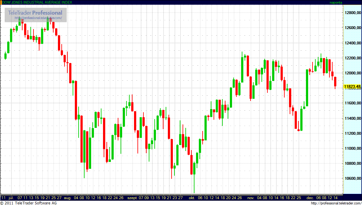 A DJIA index 131,39 ponttal, azaz 1,10 százalékkal 11.823,55 pontra csökkent. Az S&P 500-as mutató 13,91 ponttal, azaz 1,13 százalékkal 1.211,82 pontra gyengült. A technológiai részvények Nasdaq Composite mutatója 39,96 pontot, vagyis 1,55 százalékot veszített értékéből és 2.539,31 ponton zárt.