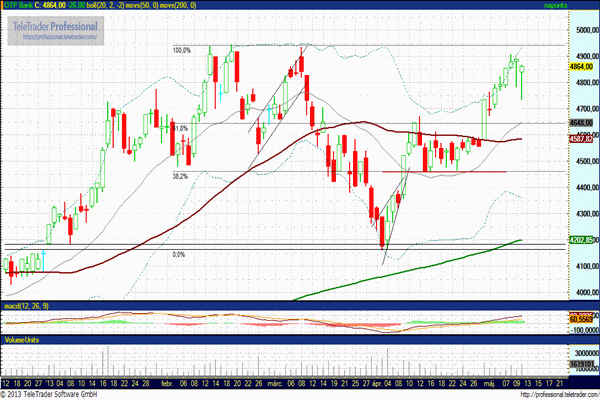 Péntek reggel elég jelentős esés mutatkozott, de sikerült visszahúzni, így a várt piros gyertya továbbra sem érkezett, ezért még fordulatról nem beszélhetünk. A 4900 forintos szint erős ellenállás, ezért újabb vétel csak áttörése után javasolt. Csökkenés során támasz 4780, illetve 4735 forintnál.