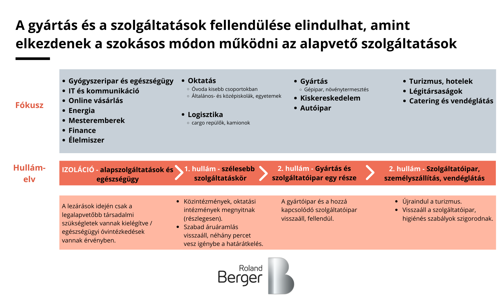 A mostanihoz hasonló szituációk kezelésére hozta létre a Roland Berger a „Megbízható újraindítás” elnevezésű akciótervet. A lezárás ideje alatt és amíg az új fertőzések aránya el nem éri a csúcspontot (becslések szerint 3–8 hét), a cselekvési terv olyan intézkedéseket ajánl, amelyekkel biztosítható a termelés ütemes és biztonságos újraindítása az adott iparágakban, szektorokban és régiókban, ahogy azt a körülmények (fokozatosan) megengedik. Ezután a termelékenység folyamatos és tudatos növelésével visszatérhetünk egy olyan gazdasági „normálhoz”, amely bizonyos szempontból akár kedvezőbb is lehet az előző állapothoz képest – fejlettebb, szerte ágazóbb digitális megoldásokkal, biztonságosabb ellátási hálózatokkal és agilisabb munkamódszerekkel lesznek felvértezve a vállalatok.
