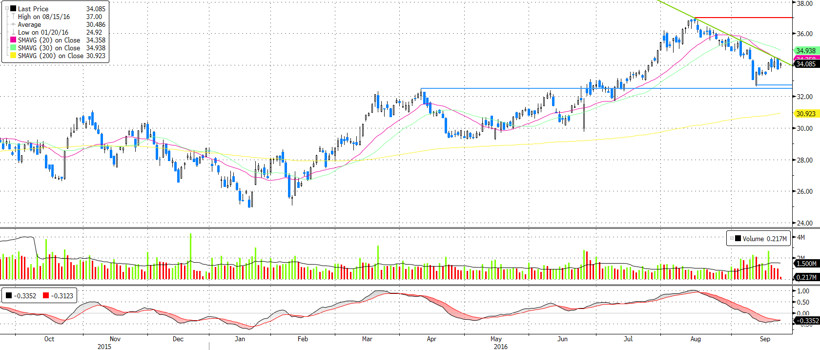 A kockázatlimitáló stop-loss megbízást a szeptemberi lokális mélypont alá javasoljuk elhelyezni 32,4 euróhoz. Így a pozíció hozam kockázat aránya meghaladja a 2:1 arányt.