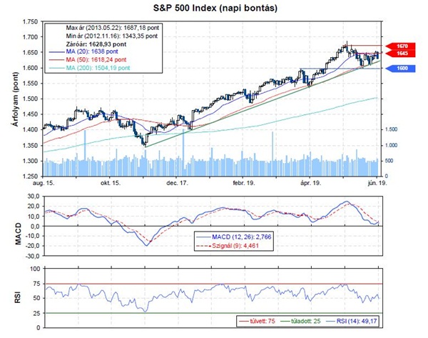 Az emelkedő trendvonal és az 50 napos mozgóátlag 1620 pontnál húzódik, itt kell majd figyelni, hogy sikerül-e visszapattannia a kurzusnak, különben 1600 pont is eshet. Ez utóbbi is egy fontos szint, mert a trendvonal alatt ez az első támasz, ahol ismét a fordulós jelzéseket érdemes keresni. Jelenleg a piacot az eszközvásárlás várható csökkenése aggasztja és egyelőre kevésbé értékeli a javuló növekedési kilátásokat, azonban a reálgazdaság helyzetének javulása a részvénypiacok számára is pozitív lenne.