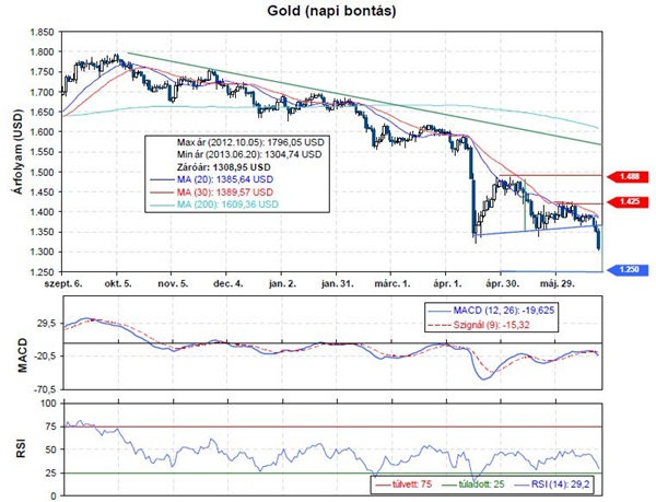 Az árfolyam a várakozásainknak megfelelően alakul, az árfolyam egy fordított füles csésze alakzatból tört ki lefelé. A célár 1250 dollárnál található, jó úton halad a kurzus a szint elérése felé. Három nappal ezelőtt kezdődött a zuhanás, de mai kereskedésben látványosan begyorsult az esés, így hamarosan az 1250 dolláros szintet is elérheti.