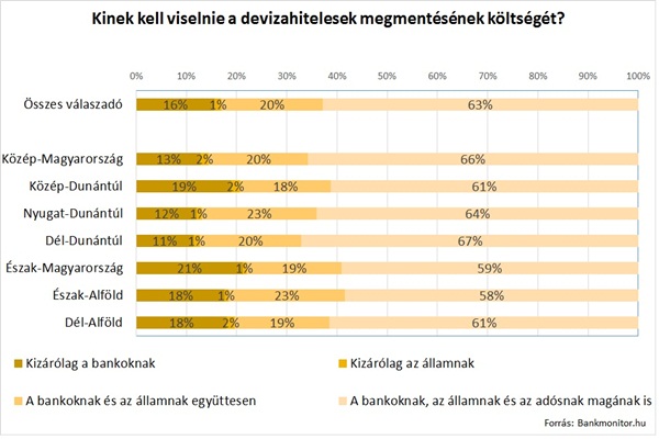 Nem csak az életkor vagy a jövedelem alapján, hanem regionális szinten is megfigyelhetők különbségek. Az ország keleti felében magasabb a mentőcsomag támogatottsága, a fejlettebb központi régió illetve Nyugat-Dunántúl esetében viszont átlag feletti azok aránya, akik nem tartják szükségesnek az adósok megmentését. Míg Észak-Alföldön a megkérdezettek 23 százaléka segítene bármi áron a nehéz helyzetbe került adósokon, addig Nyugat-Dunántúlon ez az arány mindössze 14 százalék. Hasonló képet mutat a mentőcsomag lehetséges költségviselőjére adott válasz is: a keleti régiókban az átlagosnál nagyobb arányban hárítanák a bankokra a költségeket, a Dunántúlon viszont a terhek szétterítésének magasabb a támogatottsága.