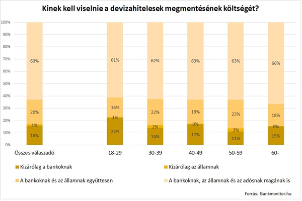Akárcsak az előző kérdés esetében, itt is megfigyelhető, hogy minél idősebb korosztályt vizsgálunk, annál magasabb a kompromisszumra törekvők aránya. Míg a 30 év alattiak 22 százaléka mindent a bankokra terhelne, addig az 50 és 60 év közöttieknek mindössze 11 százaléka gondolkodik így.