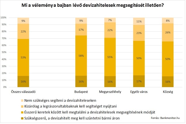 A válaszadók többsége, 53 százaléka szerint ésszerű keretek között kell megtalálni a devizahitelesek megmentésének módját, 22 százalékuk pedig csak a leginkább rászorulóknak segítene. Összesen 16 százalék azok aránya, akik szerint a devizahiteleseket bármi áron meg kell menteni, ugyanakkor minden tizedik válaszadó egyáltalán nem segítene a bajba jutott adósokon.