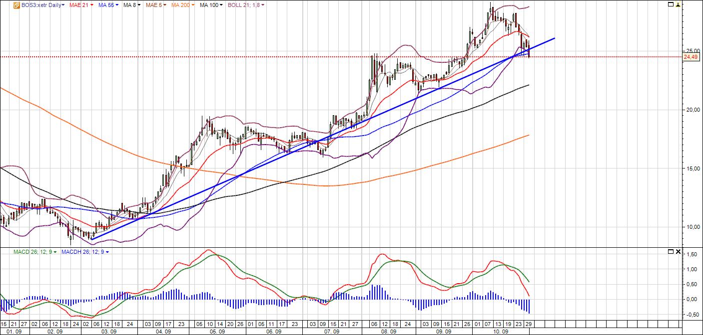 A grafikonon is látható, hogy a hírre nem reagáltak túlzott jókedvvel a befektetők, ami érthető is. A kérdés az, hogy megtörik ezáltal az amúgy emelkedő trend, vagy kitart a támaszunk. Mind a 21 napos, mind az 55 napos mozgóátlagot keresztezte az árfolyam, továbbá a bollinger szalagok is kezdenek kitágulni a megnövekedő volatilitás következtében. Elképzelésünk szerint megsérülhet a trendvonal és egészen a 100 napos mozgóátlagig zuhanhatnak az árfolyamok. Annak eleste után a 200 napos jelenthet megállót. A 200 napos elérése az idő előrehaladtával egyre magasabb szinteken történhet meg. Minél lassabban megy végbe a korrekció az árfolyamban, vagyis minél lomhább lesz az esés, mint valami lecsorgás, a mozgóátlag annál közelebb kerül az árfolyamhoz.
